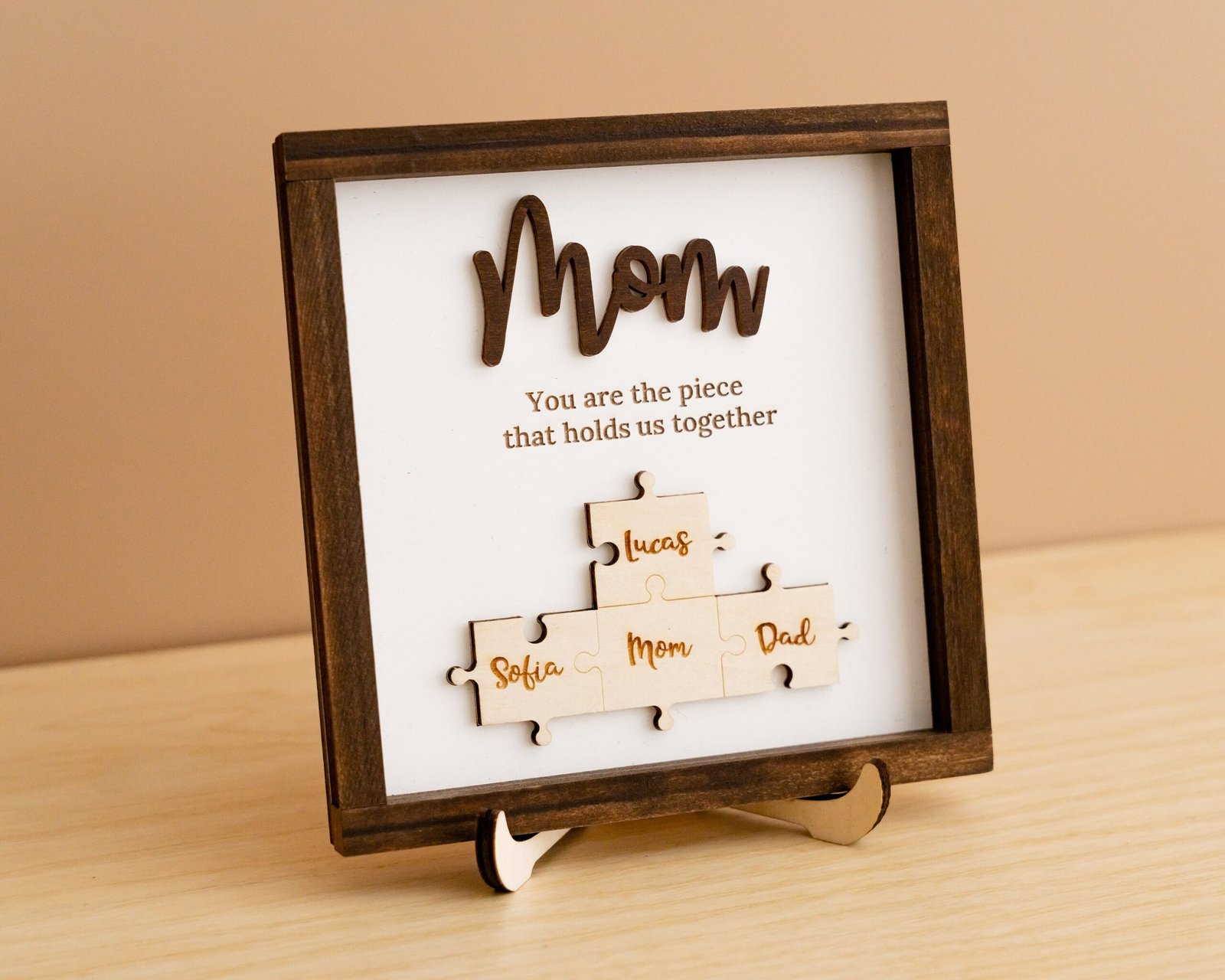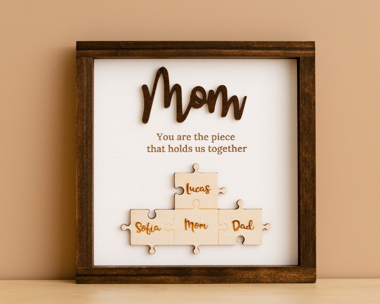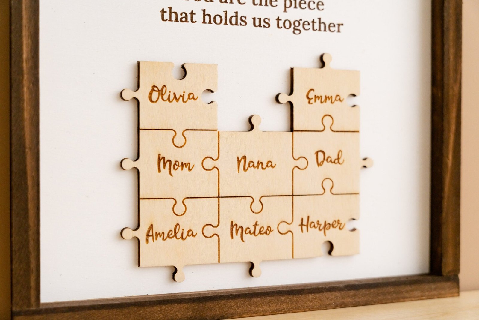 • 💬 Heartfelt Engraved Message The touching phrase “You are the piece that holds us together” is deeply engraved on the faux shiplap background, adding a meaningful layer of emotion to the overall design.