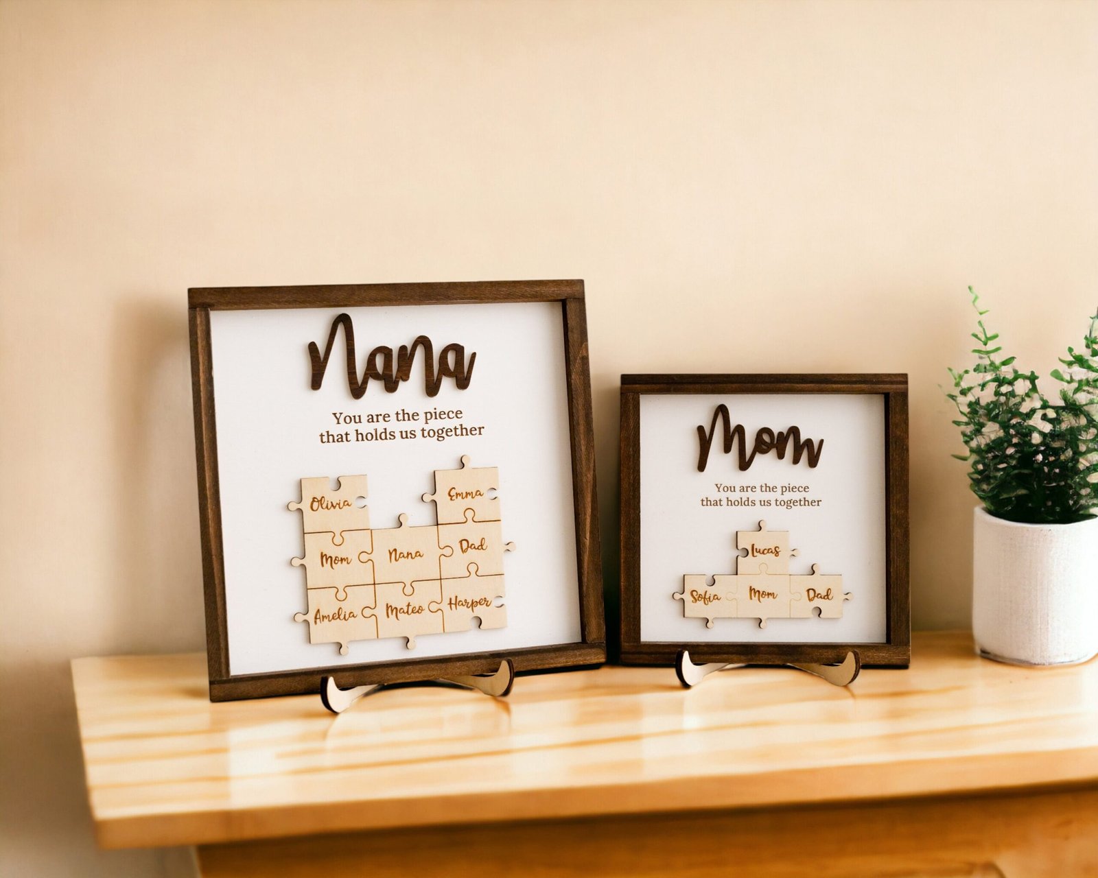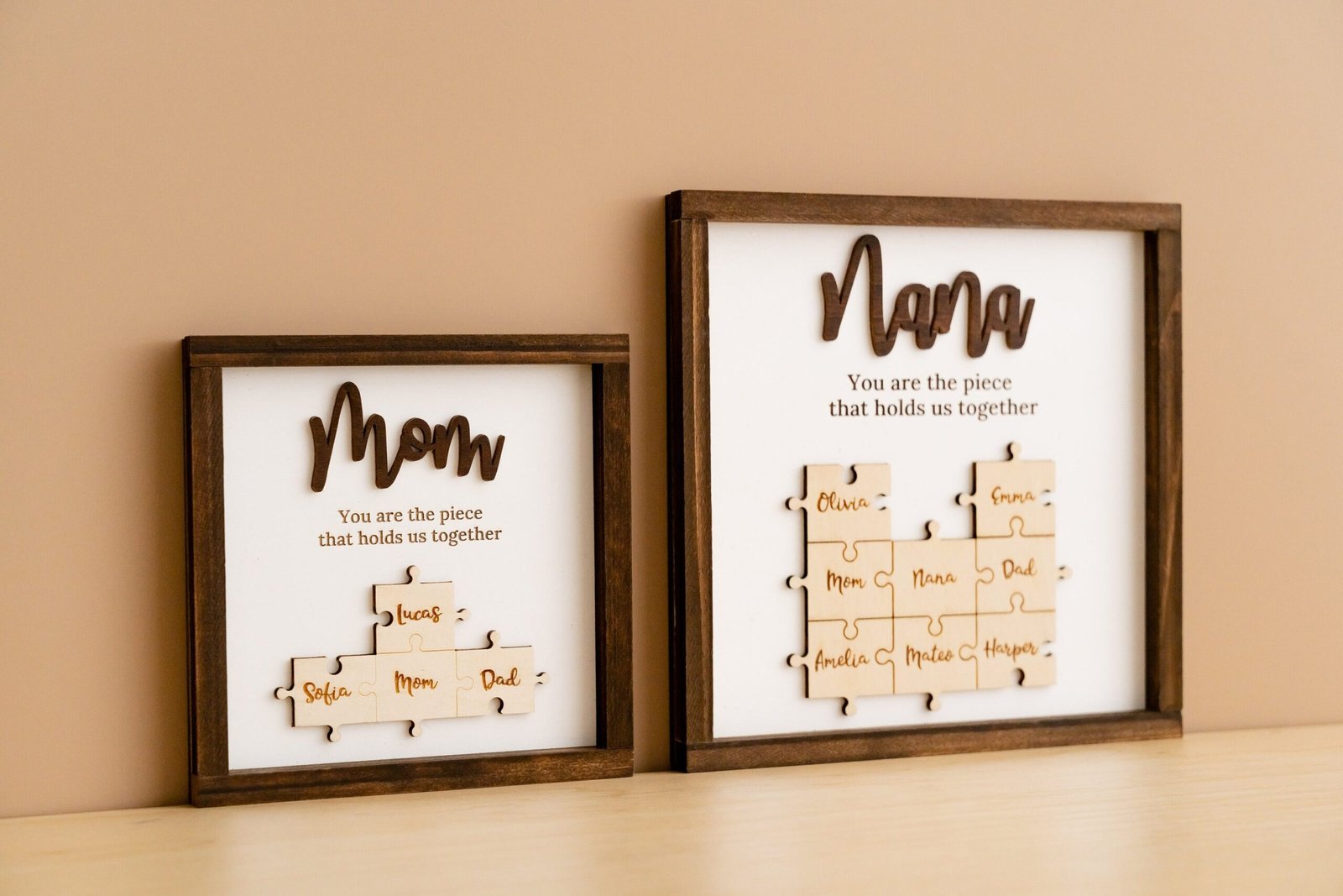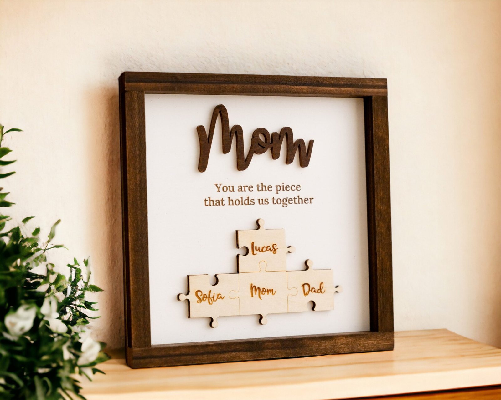 • 💬 Heartfelt Engraved Message The touching phrase “You are the piece that holds us together” is deeply engraved on the faux shiplap background, adding a meaningful layer of emotion to the overall design.