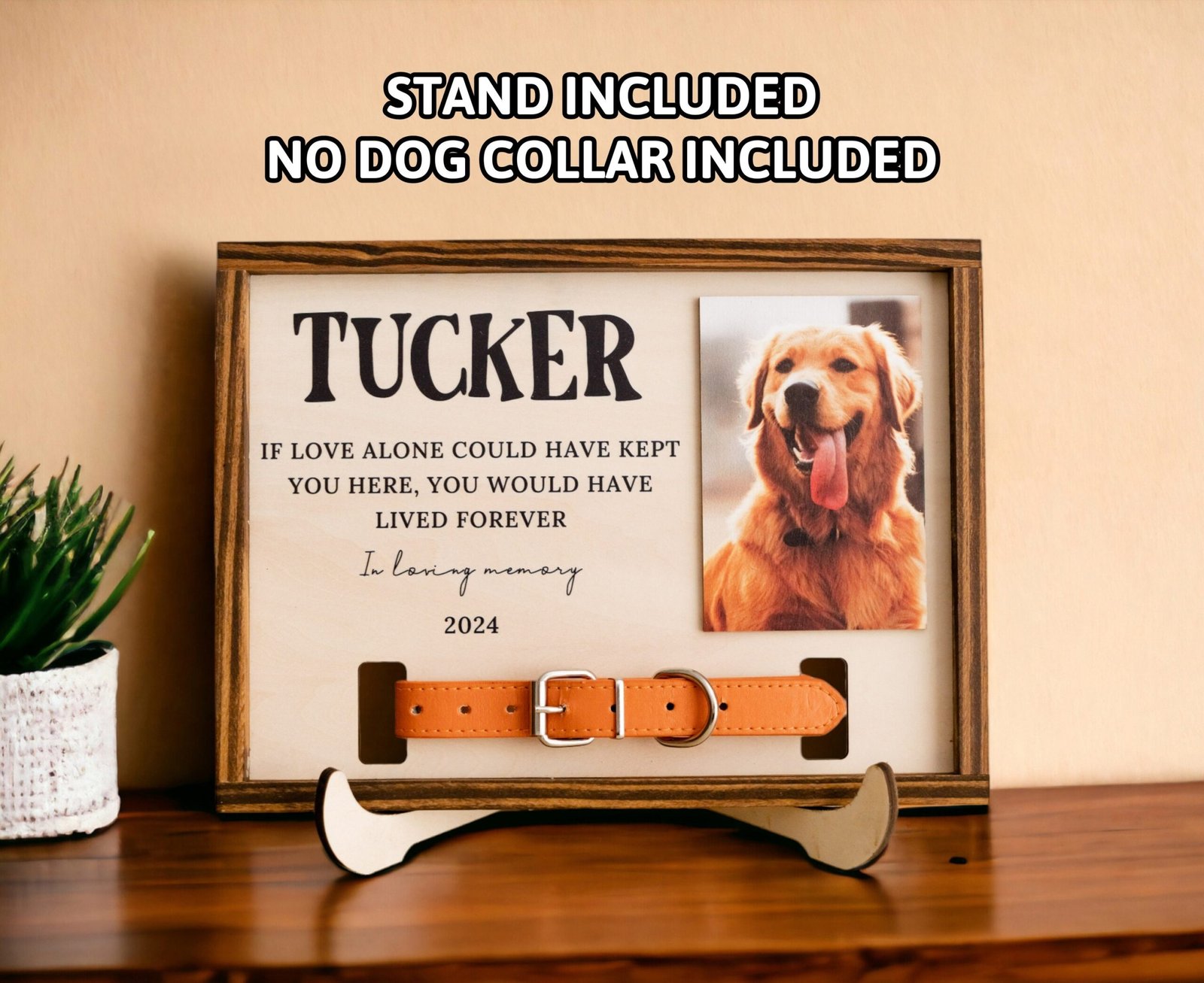 “Beautiful craftsmanship. The wood is sturdy, and the design is simple but perfect. The collar fits easily, and the photo makes it even more personal.” – Natalie M.